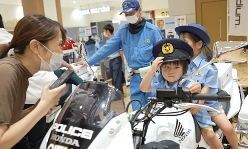 展示車両の車内設備見学や記念撮影だけでなく、地元の警察官との対話を通じて、子どもたちが交通ルールの大切さを自然に理解できる場を創出。